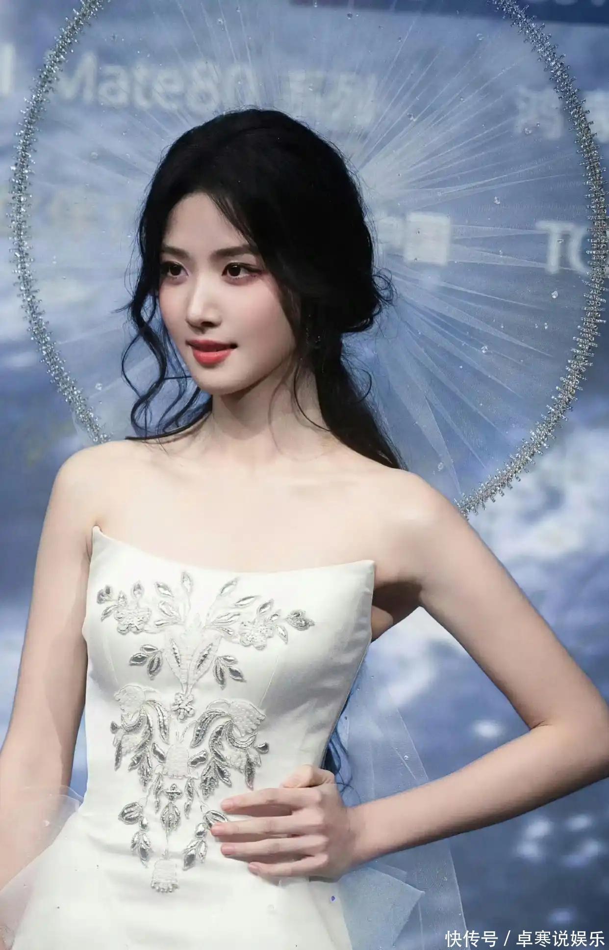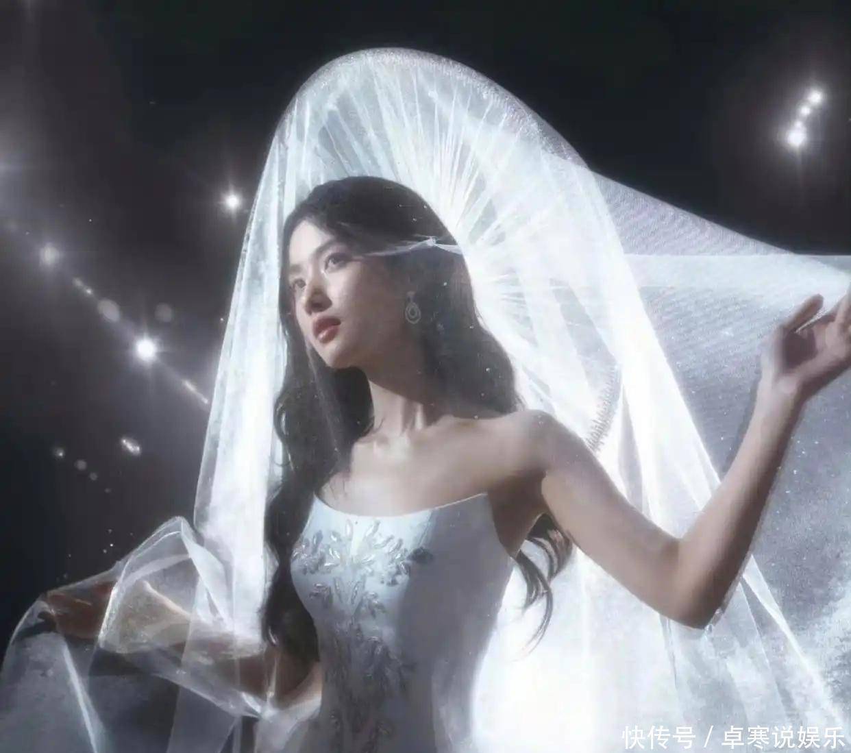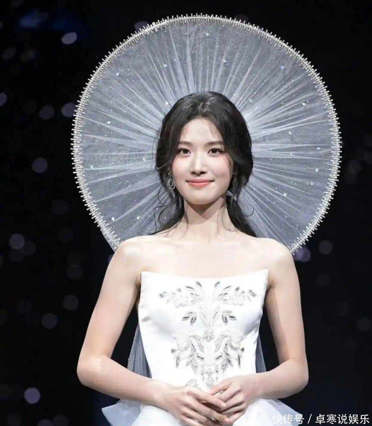 此次引爆全网的造型,是设计师MUGAZHANG为卢昱晓量身定制的高定礼服,将传统东方意象与现代时尚完美融合。主体采用纯白醋酸绸缎与水滴薄纱拼接,裙身手工缝制的细碎水晶随动作流转,宛如星河倾泻,胸口点缀的银色太空铃兰刺绣,巧妙平衡了科幻感与古典生命力。而真正的点睛之笔,是那顶直径约50厘米的斗笠式白纱圆环头饰——以传统斗笠轮廓为基底,替换为现代薄透轻纱并缀满碎钻,垂落时半遮眉眼,增添神秘疏离感,抬手掀纱的瞬间,淡颜五官在柔光下更显澄澈圣洁,被网友盛赞“兼具印度女神的神秘与希腊神女的圣洁”。